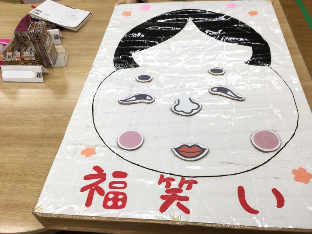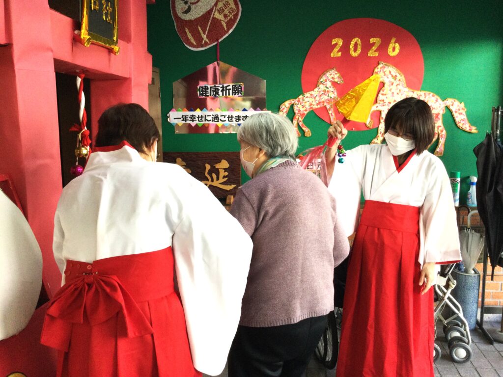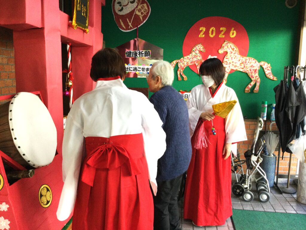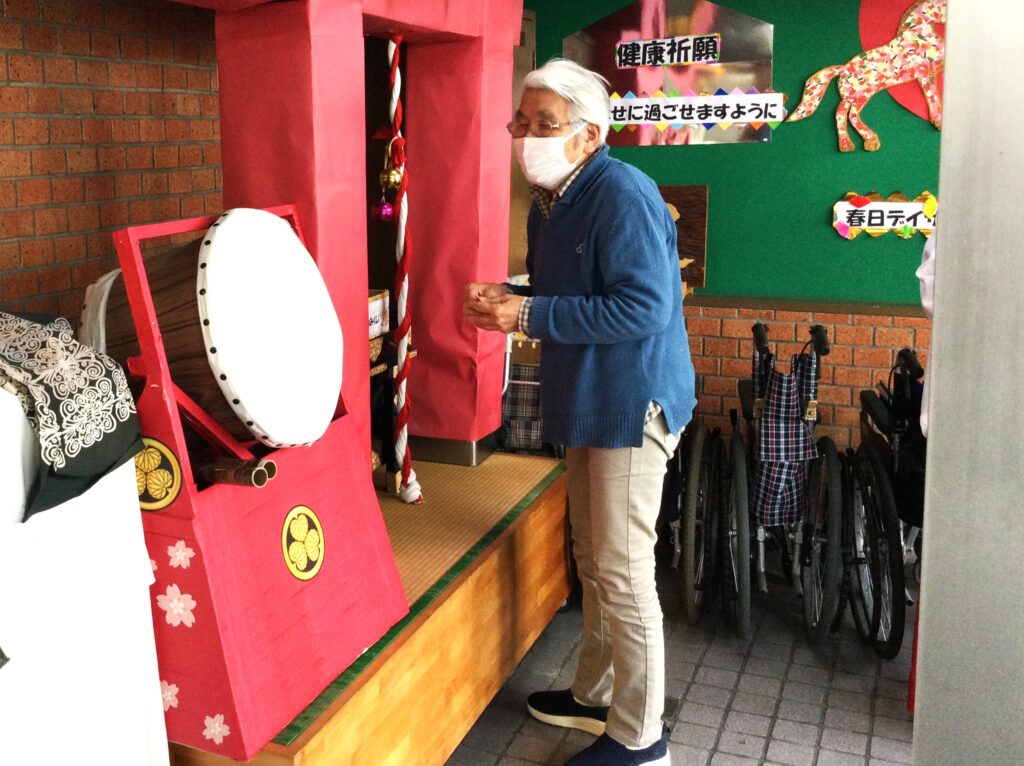 今年も春日は、春日神社初詣から始まります。巫女さんに手を引かれ、お一人ずつお参り。おみくじを引いて今年一年の吉凶を占います。そしてお正月といえば福笑い。一年の始まりは笑いから。