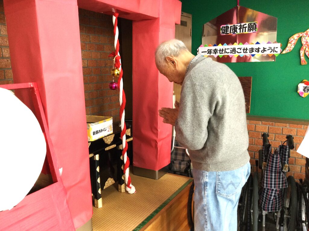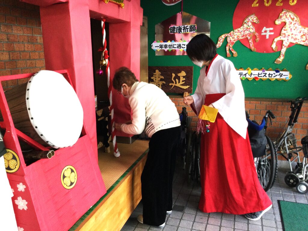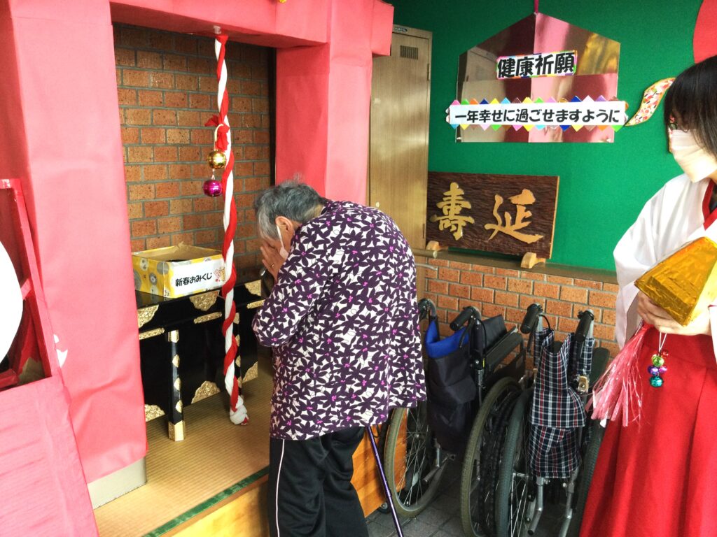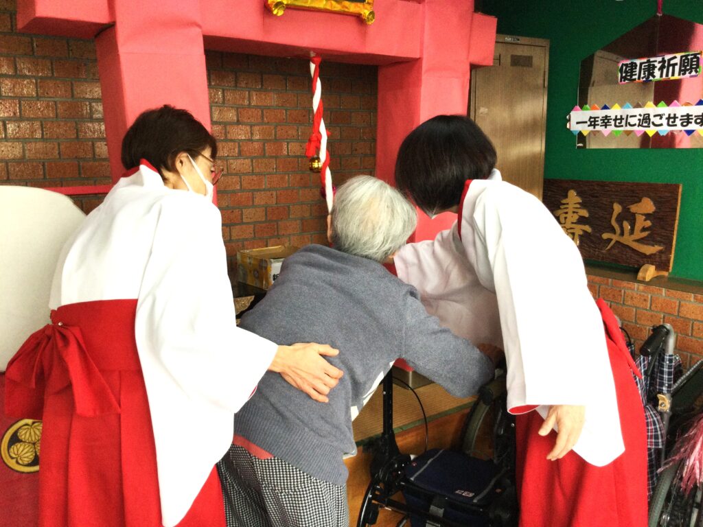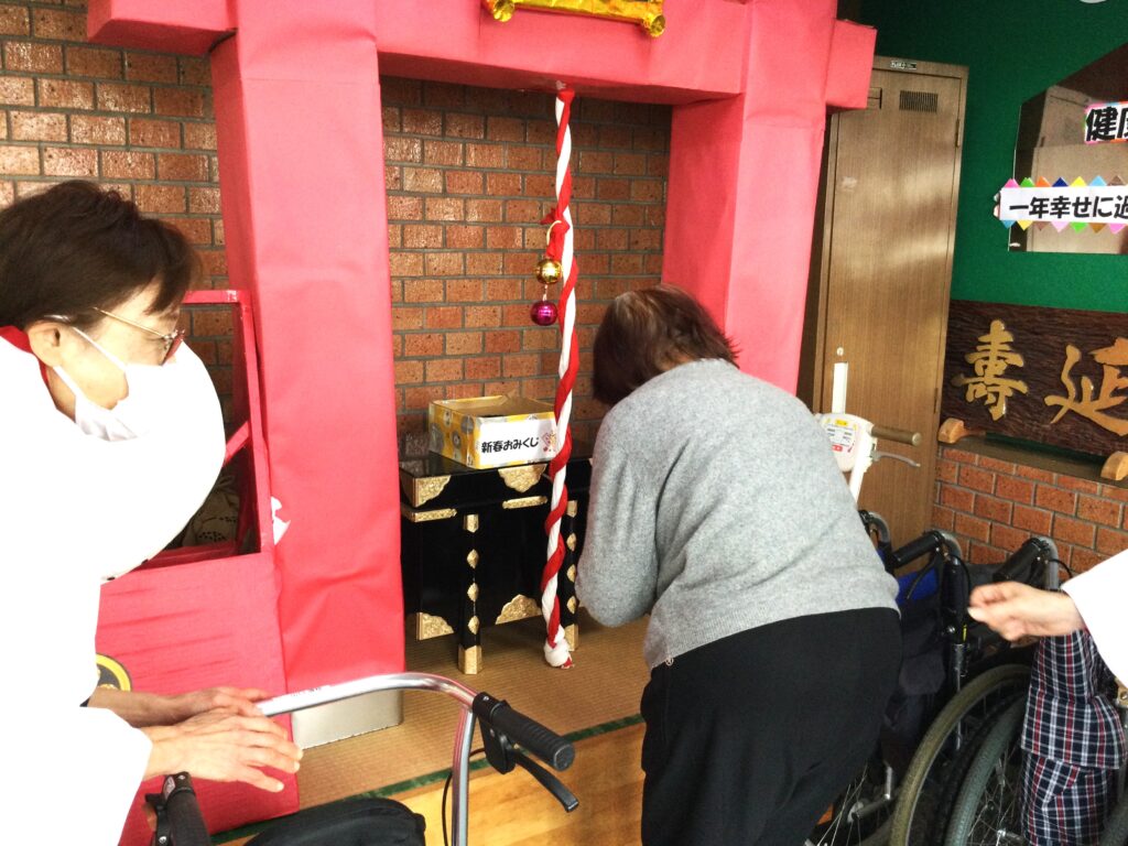 今年も春日は、春日神社初詣から始まります。巫女さんに手を引かれ、お一人ずつお参り。おみくじを引いて今年一年の吉凶を占います。そしてお正月といえば福笑い。一年の始まりは笑いから。